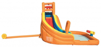 в комплекте: 1 водная горка с бассейном, 1 нагнетатель, 1 шланг для разбрызгивания воды, 1 якорный мешок, 1 комплект прочной ремонтной заплаты, 1 сумка для хранения, 2 колышка для нагнетателя и 8 колышков для аквапарка
